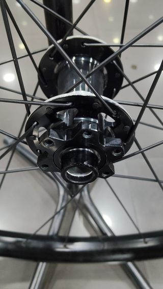 Cubos de alumínio AL6061-T6 - Cubo dianteiro 100mm QR / TX15 / TX12 - Cubo traseiro TX12/142mm Conjunto de rodas Syntium DX Axy Shimano 11s Center-lock semi-novas - para pneus clincher ETRTO 622-15c - largura do aro 20mm - altura do aro 24mm - jantes de liga leve - raios de aço inoxidável Aisi 302 - Sapim AL7075-T6 - Corpo de roda livre Shimano 11s - peso 1725g (sem QR)