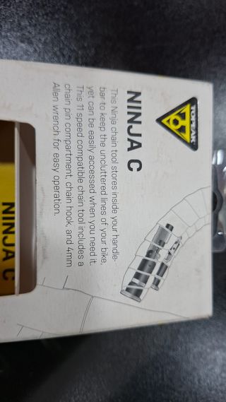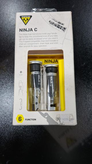 Ferramenta de corrente Topeak Ninja C, projetada para ser armazenada dentro do guidão da bicicleta. - Inclui compartimento para pino de corrente. - Possui gancho para corrente. - Inclui chave Allen de 4mm. - Compatível com 11 velocidades.