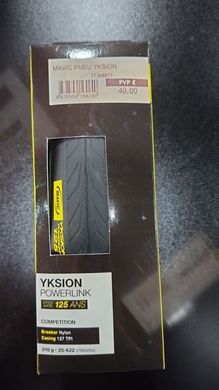 Pneu de estrada Mavic Yksion Powerlink, edição especial de 125 anos. - Tamanho: 700x25c - Peso: 210 g - Construção: Breaker Nylon, Casing 127 TPI - 3 unidades em stock