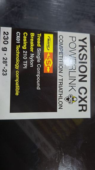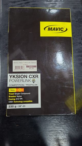 Pneu de estrada Mavic Yksion CXR Powerlink Tubular ideal para competição e triatlo. - Tamanho: 700x23c - Composto de piso: Single Compound - Protetor: Nylon Breaker - Carcaça: 210 TPI - Compatível com tecnologia CX01 - Peso: 230g