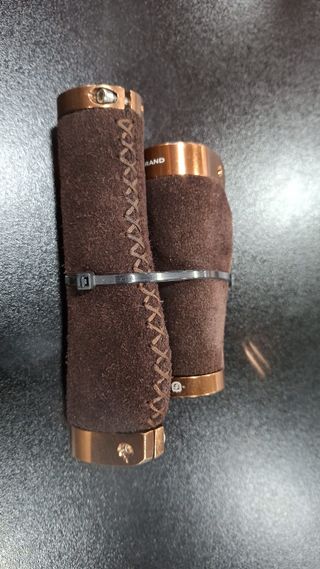 Par de punhos Legrand Sumac novos, com acabamento em cobre e revestimento em camurça. - Marca: Legrand - Modelo: Sumac - Cor: Cobre e castanho - Material: Cobre e camurça - Condição: Novos