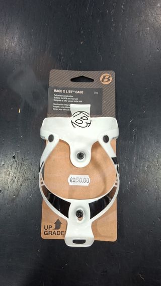 Suporte de bidão Bontrager Race X Lite em carbono, na cor branca. Construção em carbono integral. 2 em stock - Cor: Branco - Material: Carbono - Peso: 25g - Adequado para uso em BTT e estrada