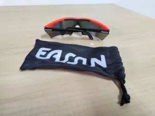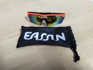 Óculos de ciclismo da marca EASSUN com lentes espelhadas e armação laranja. - Lentes com acabamento espelhado. - Armação na cor laranja vibrante. - Inclui bolsa de proteção preta com o logo EASSUN.