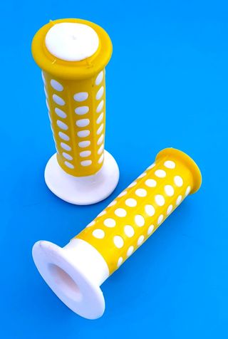 Conjunto de punhos para bicicleta BMX, com um design clássico e vibrante. Ideal para Bicicletas BMX Haro GT Performer Peugeot CPX BH montesa Derbi Mongoose Yamaha BYZ Orbita Confersil Dia Compe - Cor amarela com padrão de bolinhas brancas. - Parte inferior em branco. - Material de borracha para melhor aderência.