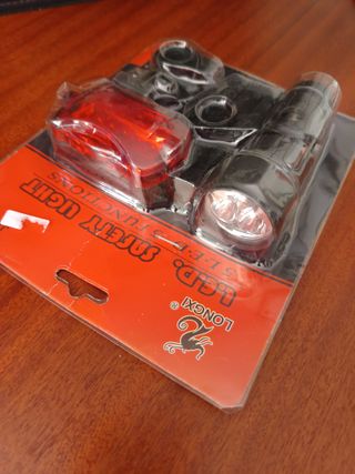 Lanterna dianteira, luz branca, com 3 LEED Lanterna traseira, luz vermelha, com 5 LED e 7 modos Baterias AAA (não incluídas) Dimensões Dianteira: 10.2 x 3.5cm (L*D) Traseira: 6.8 x 4 x 2.7cm (L*W*T) Material: Plástico