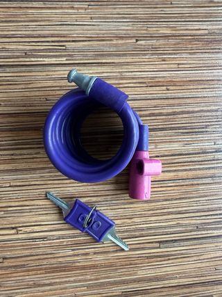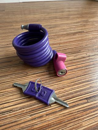 Cadeado de segurança com cabo espiral revestido, ideal para proteger bicicletas, trotinetes ou motas. Cor vibrante roxa e rosa – fácil de identificar, mesmo à distância. Inclui duas chaves com pega em borracha. 📏 Comprimento aproximado do cabo: 1 metro 🔑 Chaves incluídas: 2