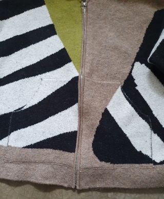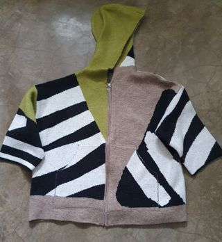 Casaco de malha com dois bolsos, fecho de correr, com capuz, várias cores a faxer um contraste uniforme, tamanho único. Sem uso