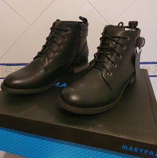 Botas de cano médio em preto. Com fivela de lado, fecho de correr e atacadores. Novas, sem uso com caixa original e etiqueta.