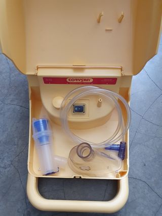 Aparelho de aerosolterapia Corysan, para uso doméstico. Nebuliza medicamentos. Novo sem uso. Design compacto e portátil Equipado com: -tubo de ligação -ampola "Neboplus" -tampão para ampola -bocal -máscara -filtro -manual de instruções