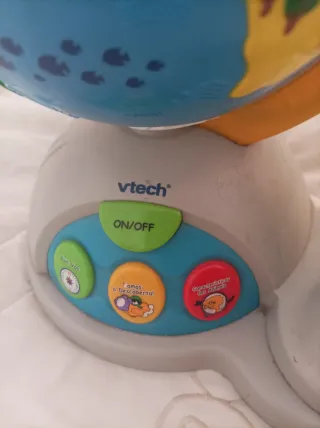 Globo educativo da VTech com base e joystick. - Globo interativo com mapa. - Base com botões. - Joystick para navegação.