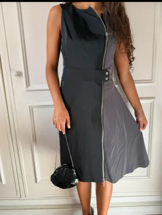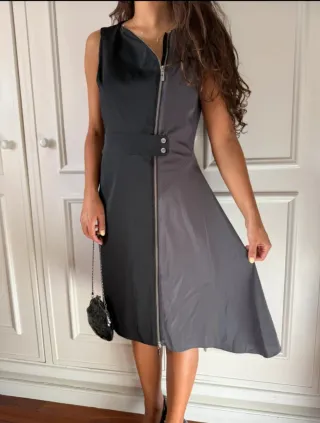 Vestido assimétrico com fecho frontal. - Design moderno em duas cores. - Detalhe de cinto na cintura. - Fecho de correr visível.