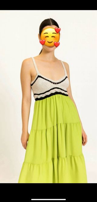 Vestido feminino com um design moderno e elegante. - Top em crochet com detalhes em preto. - Saia longa em camadas de cor verde vibrante.