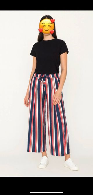 Calça pantalona com listras verticais em azul, branco e vermelho. - Cintura alta. - Pernas largas e fluidas. - Tecido leve.