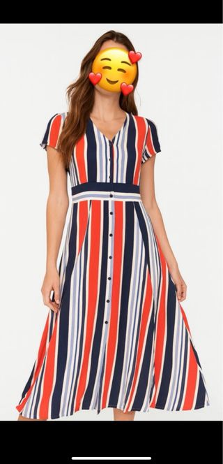 Vestido feminino com padrão às riscas verticais em azul, branco e vermelho. Possui fecho de botões na frente - Decote em V. - Mangas curtas.