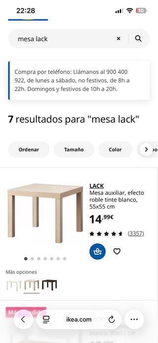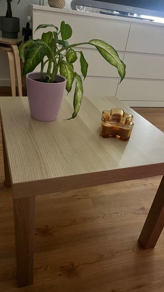 Mesa de centro LACK da IKEA, com um design moderno e funcional. - Tampo em madeira com acabamento natural. - Pés em madeira com um toque de cor rosa.