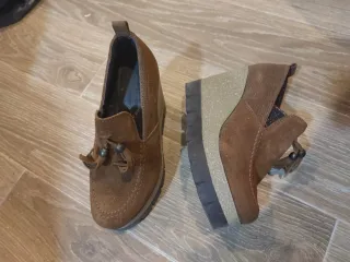 Sapatos elegantes em camurça com salto cunha. - Material exterior em camurça. - Detalhe de borlas na frente. - Sola robusta.