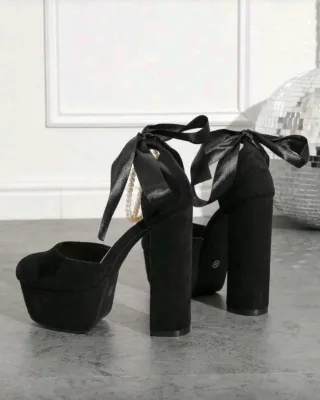 Sapatos de salto alto pretos com plataforma e detalhe de pérolas e laço. - Design elegante com plataforma. - Tira no tornozelo com pérolas e laço. - Salto grosso robusto.