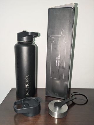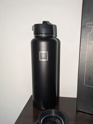 Garrafa térmica Iron Flask com tampa de canudo e tampa de rosca. - Cor preta com detalhes em prata. - Material resistente de metal e plástico Nova, nunca utilizada.