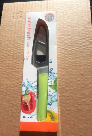 Faca da marca Nutrifresh com lâmina de serrilha dupla e corte reto. Possui cabo ergonómico. - Lâmina em metal. - Cabo em plástico. - Comprimento da lâmina: 10cm (4in).
