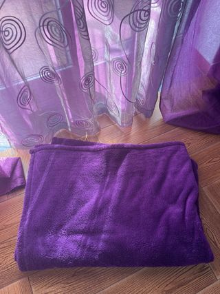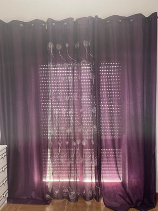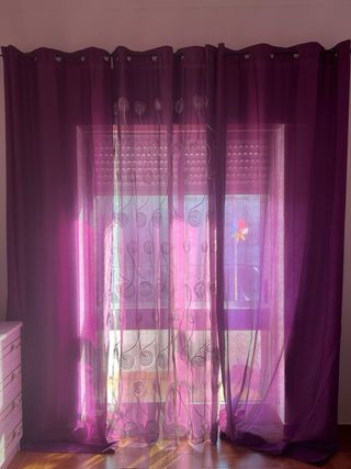 Conjunto de três cortinados em tecido poliéster. - Cor roxa com detalhes transparentes. - Podem ser vendidos em conjunto 20€ ou individualmente 7€ cada