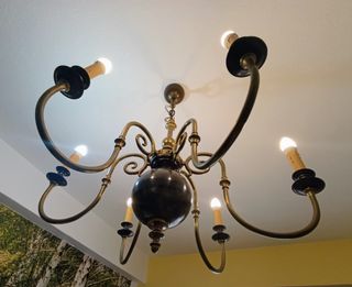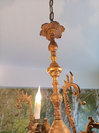 Candeeiro de tecto clássico suspenso, fabricado em latão, de 6 braços/lumes que terminam com base circular em latão e imitação de vela de cera, de meados do século XX. Artigo usado em excelente estado geral com eletrificação revista e 100% funcional. Possui grande poder de iluminação, adequado para grandes divisões. Oferta de 6 lâmpadas led casquilho fino (E14) novas de 50Hz 4w (320LM e 2700k). Mede 90cm diâmetro e 85cm altura. Pesa 7,360kg. Levantamento em Abrantes. Possibilidade de entrega dependendo da localização e com acréscimo de preço a combinar. Em caso de envio irá desmontado.