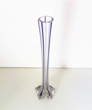 Jarra fina em vidro translúcido com fios azuis, com base recortada em forma de pétala. Em estado seminovo. Mede 30,5cm altura x 7,5cm largura da base em forma de parra. Pesa 292g. Possibilidade de entrega em Abrantes ou arredores. Também poderei enviar por correio. Veja também os meus outros anúncios, ateste a minha classificação de vendedor e a antiguidade enquanto utilizador registado.