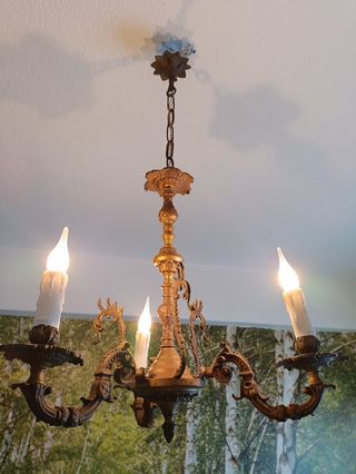 Candeeiro antigo, em latão vazado, pesado e ornamentado, de 3 braços/lumes, usado em excelente estado geral e funcional. Toda a eletrificação foi revista e testada, as antigas imitações de velas foram substituídas por novas. Estão incluídas 3 lâmpadas led tipo E14 5w (novas), as vistas nas fotos. Pesa 3,310kg. Mede 67cm altura total x 45cm diâmetro. Levantamento em Abrantes, possibilidade de entrega dependendo da localização e com acréscimo de preço a combinar. Possibilidade de envio pelos correios (parcialmente desmontado) com respetivo acréscimo de preço. Veja também os meus outros anúncios.