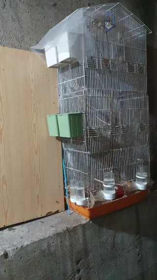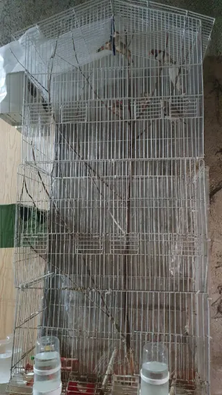Vendo gaiola com 130cm de altura, com uma lateral com acrílico cortado à medida para poder ver os pássaros mais livremente, com o fundo de plástico como as gaiolas normais, com 4 ninhos e cada um custou mais de 10€ no agriloja, 4 comedouros e 4 bebedouros, 2 potes para meter a papa, vários poleiros, ramos de uma árvore para os pássaros pousarem e continuarem ligados com a natureza. 2 casais de mandarins e vários filhos. A gaiola pode ser usada para outro tipo de aves, como piriquitos ou agapornis. Preço negociável.