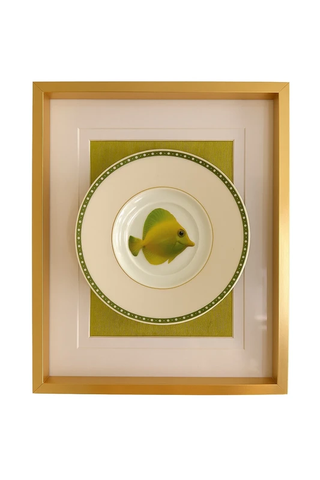 Mais do que um quadro — uma composição de textura, cor e luz. O dourado abraça o verde, o peixe flutua em porcelana. Uma peça única assinada por Carla Gaifém.