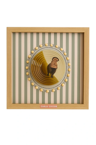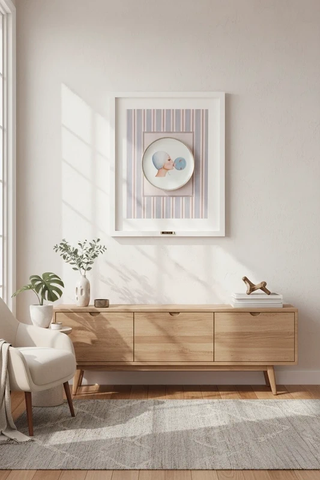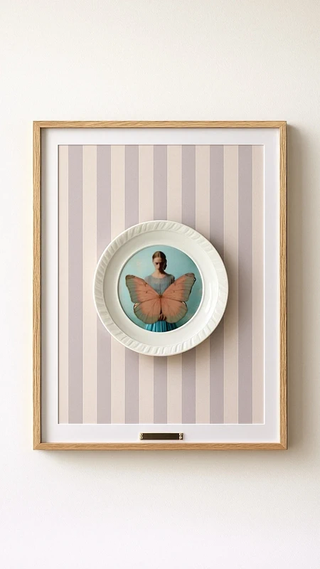 Título: o sopro do oceano interior Dimensões: 42.5*52.5 Peça única, By Carla Gaifém Uma composição delicada e sofisticada onde a figura feminina, serena e elegante, sopra vida a um pequeno mundo azul repleto de peixes dourados. O prato cerâmico, aplicado sobre um fundo gráfico de riscas suaves, cria um jogo de profundidade e textura que transforma esta peça numa fusão perfeita entre arte, design e poesia visual. A harmonia entre os tons pastel e o brilho subtil da porcelana confere-lhe um carácter contemporâneo, feminino e intimista — fazendo deste quadro uma peça única que convida à contemplação e acrescenta personalidade a qua