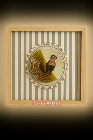 O Guardião do Silêncio Nesta obra, combino humor e mistério num diálogo entre o insólito e o elegante. O protagonista — uma figura que parece emergir de um túnel dourado — simboliza a introspeção e a força tranquila de quem observa o mundo sem se perder nele. As riscas verticais evocam disciplina e equilíbrio, enquanto o círculo central cria movimento e profundidade, como um portal entre o real e o imaginário. Uma peça que convida à contemplação e desafia o olhar a descobrir novas camadas a cada observação. Dimensões: 32.5*32.5 (com moldura incluída) Peça única. Mais informações por mp.