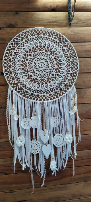Lindo caça sonhos feito em crochet, com um design delicado e artesanal. Perfeito para decorar qualquer ambiente. - Diâmetro: 47 cm - Detalhes em fitas e corações