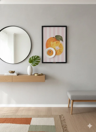 Doce Citrus” é uma peça que celebra a intensidade vibrante da laranja e a sua energia luminosa. A composição combina ilustração e porcelana num diálogo visual fresco, onde a fruta se transforma em palco artístico e a figura centra-se como elemento surpreendente e delicado. Sobre um fundo às riscas em tons suaves, o contraste entre o laranja vivo e o cenário romântico cria uma peça única, cheia de ritmo e personalidade. Pensado para quem gosta de decoração com carácter, cor e um toque de irreverência, este quadro traz vida a qualquer ambiente, unindo arte, design e estética contemporânea. Peça exclusiva — criada manualmente, com el