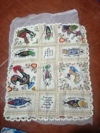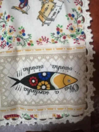 Pano de cozinha com um bonito padrão. - Acabamento com bicos decorativos. - Design com motivos portugueses e peixe. - Tecido estampado com várias cenas.