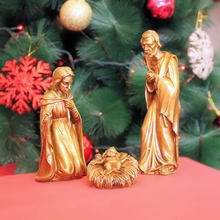 Presépio em marfinite, pintado à mão, em dourado suave metálico e escurecido com uma patine marron a óleo, assinado pela pintora e protegido com verniz. Nas bases todas as peças estão protegidas com veludo. Trata-se de um conjunto que alude à época natalícia. Dado se tratar de uma peça pintada à mão, assume uma característica de única e por isso apenas é disponibilizado um único exemplar. As dimensões (cm) aproximadas de cada peça, individualmente: "José": (CxLxA) 7 x 7 x 18; "Maria":(CxLxA) 7 x 7 x 14; "Jesus":(CxLxA) 6 x 8 x 3.