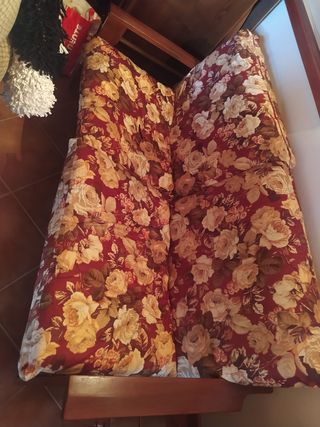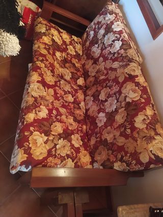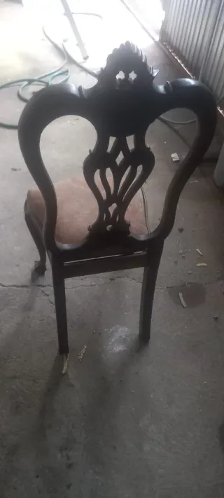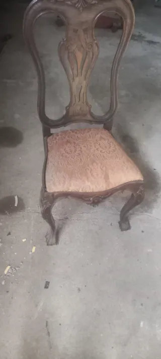 Cadeira antiga e espelho com um design clássico e elegante. - Estrutura em madeira. - Assento em tecido com padrão floral.
