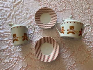 porcelana da marca ML Home Collection - Inclui um bule, um cremer e oito pratos pequenos - Apresenta um design delicado com ursinhos e corações. - Peças em ótimo estado, sem lascas ou trincas.