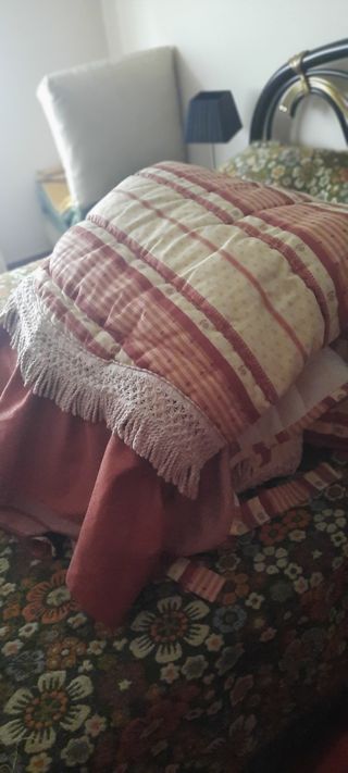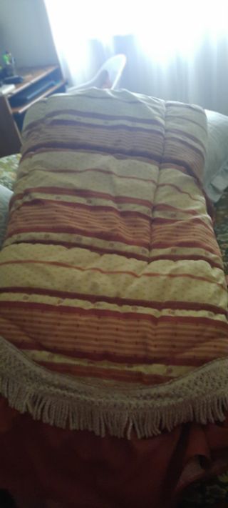 Edredão de inverno para cama de casal, em ótimo estado. - Padrão às riscas em tons de bege e vermelho. - Acabamento com franjas decorativas.