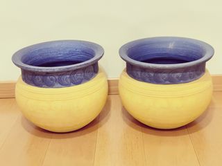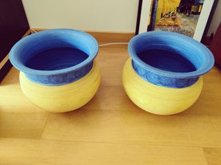 2 potes decorativos em cerâmica/terracota, pintados em amarelo e azul, com formato arredondado. Podem ser usados como vasos para plantas ou simplesmente como peça decorativa. - Conjunto composto por 2 potes iguais (30 cm largura no topo, 26 cm altura) - Interior e bordo em azul intenso, exterior em amarelo com relevo - Ideais para plantas de interior, varandas ou jardins - Também podem ser usados para guardar revistas, mantas pequenas, etc. - Em bom estado geral, com pequenos sinais de uso normais da idade (ver fotos) Ficam muito bem lado a lado em hall de entrada, sala ou varanda, trazendo um ar mediterrânico/solar à casa.