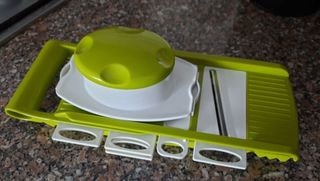Ralador multiusos, com 5 lâminas de corte diferente. Raramente usado, mas de estar guardado a parte branca ficou ligeiramente amarelada.
