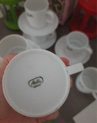 Conjunto de chávenas para chá ou café, estilo cafetaria. Composto por 7 chávenas e 5 pires. Uma chávena ou outra com marcas de uso. Mas em excelente estado. Marca alemã Melitta