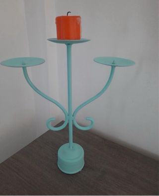 Porta velas reciclado, castiçal, em latão, robusto e pesado. Efeito desgastado. Suporta 3 velas. Não inclui velas. Cor turquesa. Muito bonito.