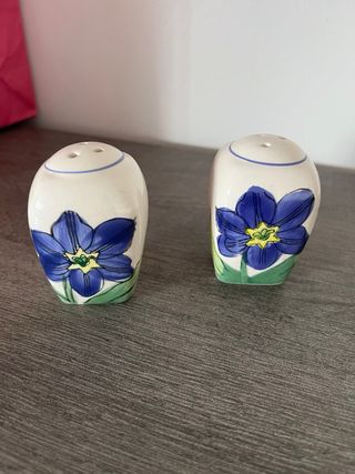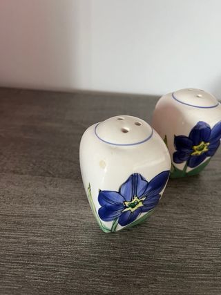 Conjunto de saleiro e pimenteiro pintado à mão. Desconheço a marca. Um deles tem uma pequena marca de uso. De ver esto nada a apontar.