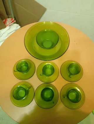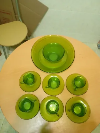 Conjunto vintage de Duralex em vidro verde. Inclui uma travessa grande com uma tigela menor dentro, e seis conjuntos de chávenas com pires. - Material: Vidro - Cor: Verde - Estilo: Vintage
