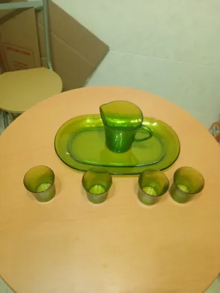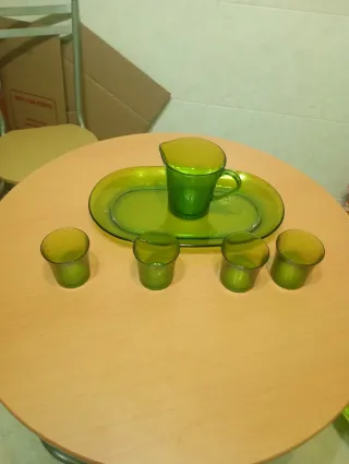 Conjunto vintage Duralex em vidro verde. - Travessa oval - Jarra - 4 copos