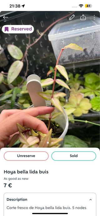 Hoya cumingiana enraizada e em crescimento. Não sou particularmente fã dos serviços de envio da Wallapop com os CTT, por isso peço que ao fazerem a compra escolham a Inpost. Caso o comprador queira também posso enviar por UPS, e fazer a venda fora do Wallapop. Não me responsabilizo por quaisquer danos ou perdas feitas pelos CTT.