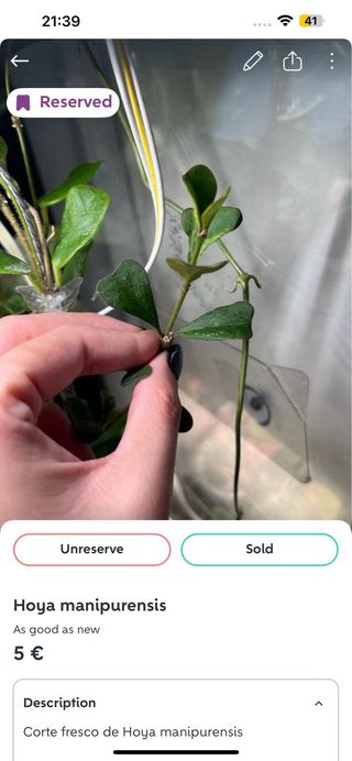 Corte fresco de Hoya nicholsoniae Não sou particularmente fã dos serviços de envio da Wallapop com os CTT, por isso peço que ao fazerem a compra escolham a Inpost. Caso o comprador queira também posso enviar por UPS, e fazer a venda fora do Wallapop. Não me responsabilizo por quaisquer danos ou perdas feitas pelos CTT.