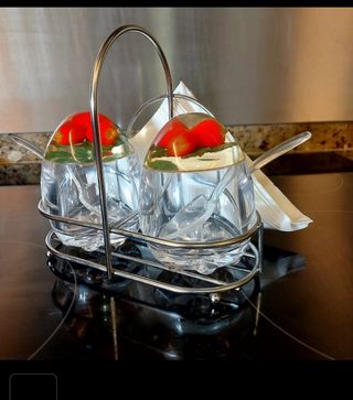 Linda Compoteira constituída por : 1 suporte, 2 compoteiras em acrilico com tampa 2 colheres O suporte dá também para suporte guardanapos. As tampas das compoteiras tem interiormente uns lindos e garridos morangos , o que torna a peça muito bonita e atrativa em qualquer mesa . Alt- 17cm Larg - 20 cm