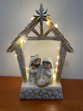 Lindo presépio de Natal com detalhes em dourado e branco, perfeito para decorar sua casa. - Base com textura de pedra. - Estrela decorativa no topo. - Luzes de LED integradas para um brilho acolhedor. 12 cm altura e 9 cm comprimento