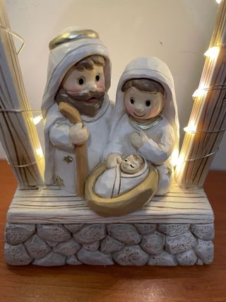 Linda peça de presépio com a Sagrada Família. - Detalhes em dourado. - Base em tom de madeira. 17 cm altura e 12 cm comprimento